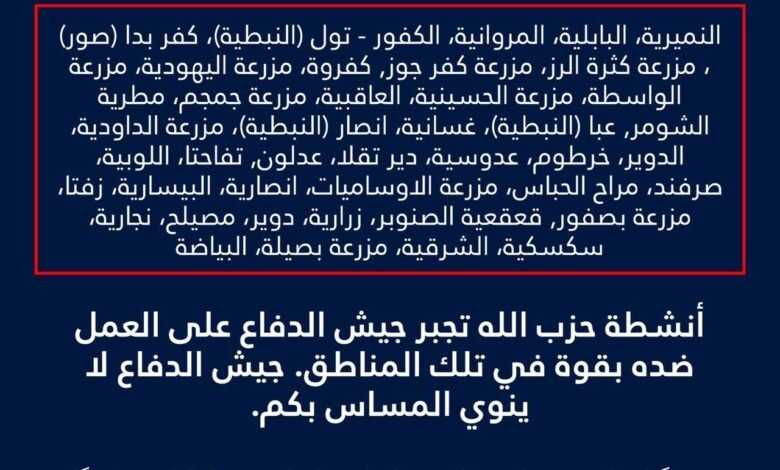 وبحسب التحذير، فإن ما وصف بـ”أنشطة” حزب الله في تلك المناطق قد يدفع جيش الدفاع الإسرائيلي إلى تنفيذ عمليات عسكرية، مع التأكيد أن الهدف ليس استهداف المدنيين.