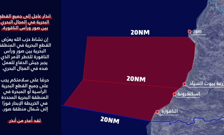 صدر إنذار إسرائيلي عاجل موجّه إلى جميع القطع البحرية المتواجدة ضمن المجال البحري الممتد بين صور ورأس الناقورة، في خطوة تعكس تصاعد التوتر في المنطقة البحرية الجنوبية.