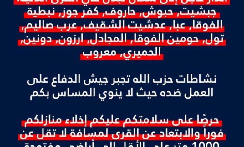 نشر المتحدث باسم الجيش الإسرائيلي أفيخاي أدرعي تحذيراً عاجلاً عبر حسابه على منصة X، موجهاً إلى سكان لبنان، في ظل التطورات الأمنية المتسارعة في المنطقة